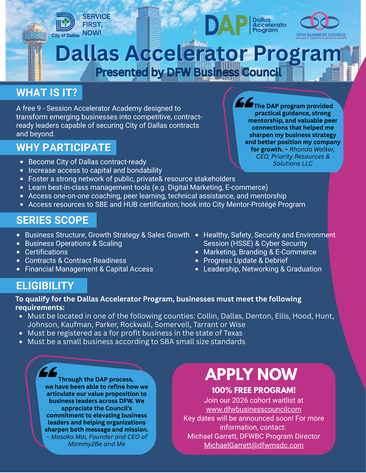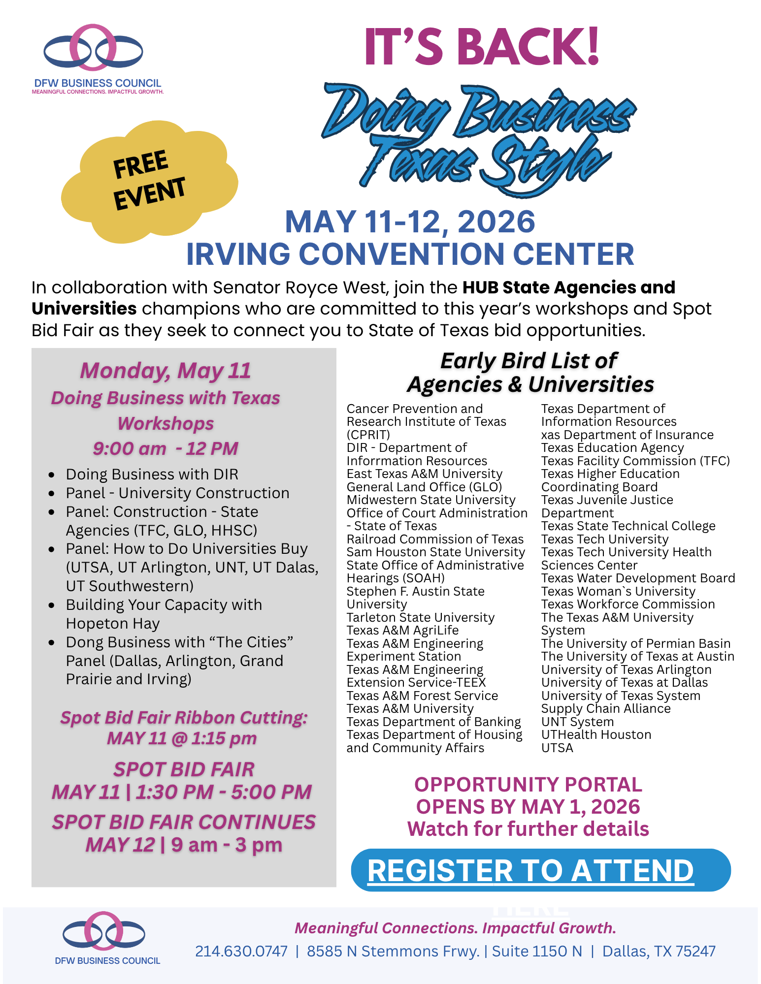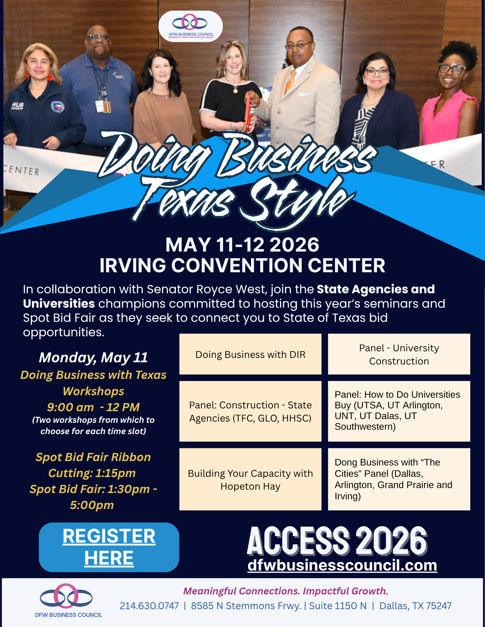 Since the Acting Comptroller’s emergency rules recently decertified over 15,000 minority- and women-owned businesses (as of early 2026), the DFW Business Council is working with partners to reinstate the State of Texas HUB program for minority- and women-owned businesses. We are working to restore equitable access to state procurement. Businesses right to compete for state contracts shouldn’t be sidelined.