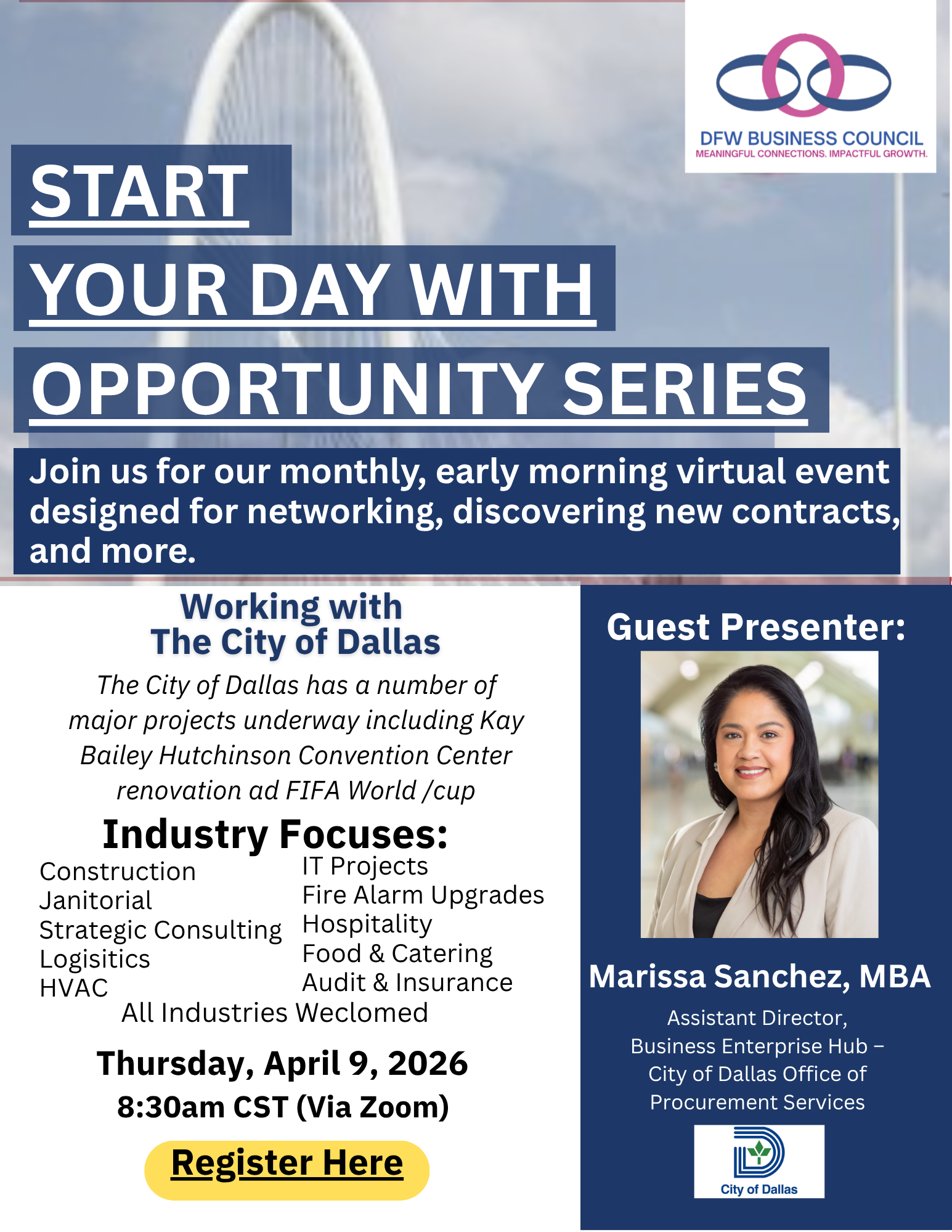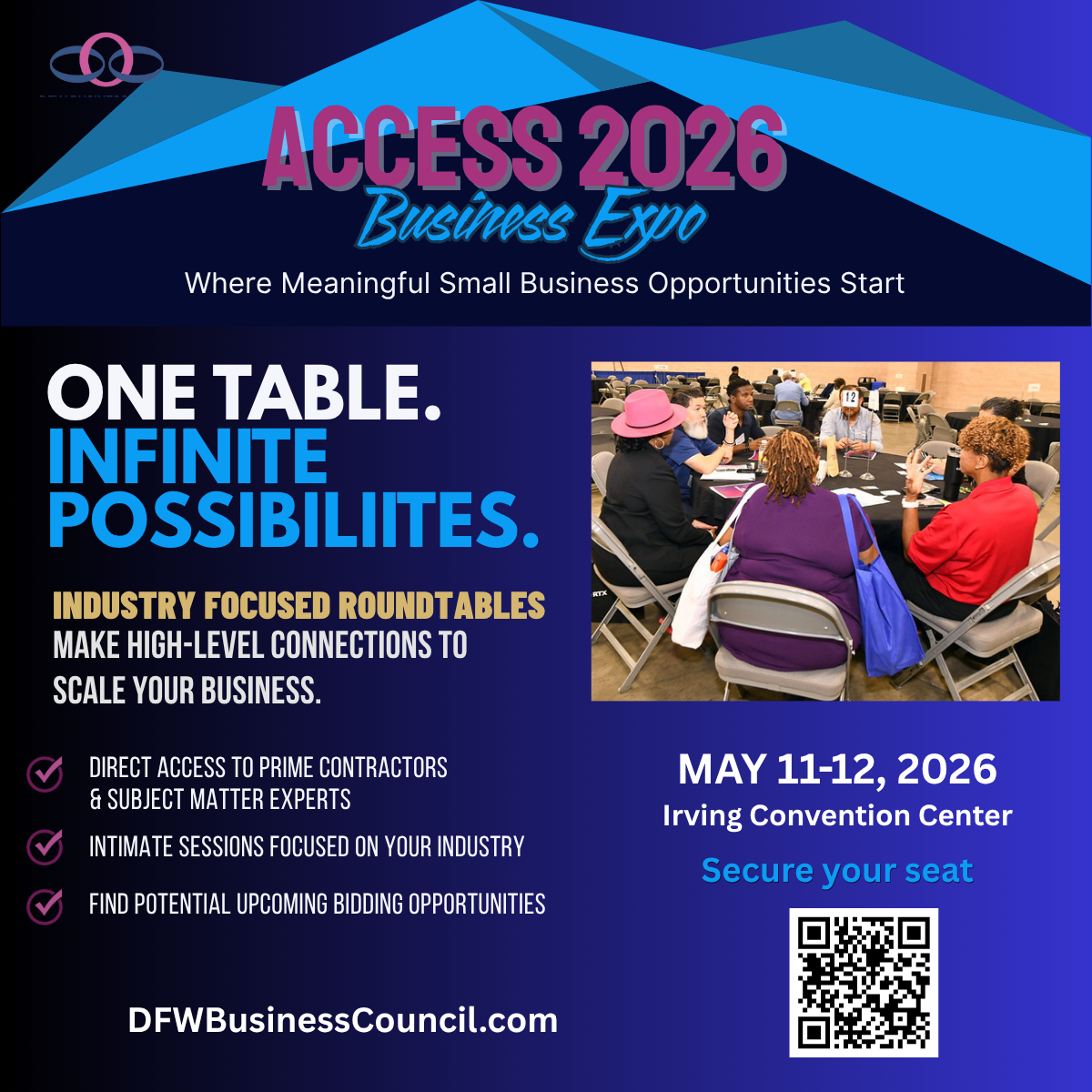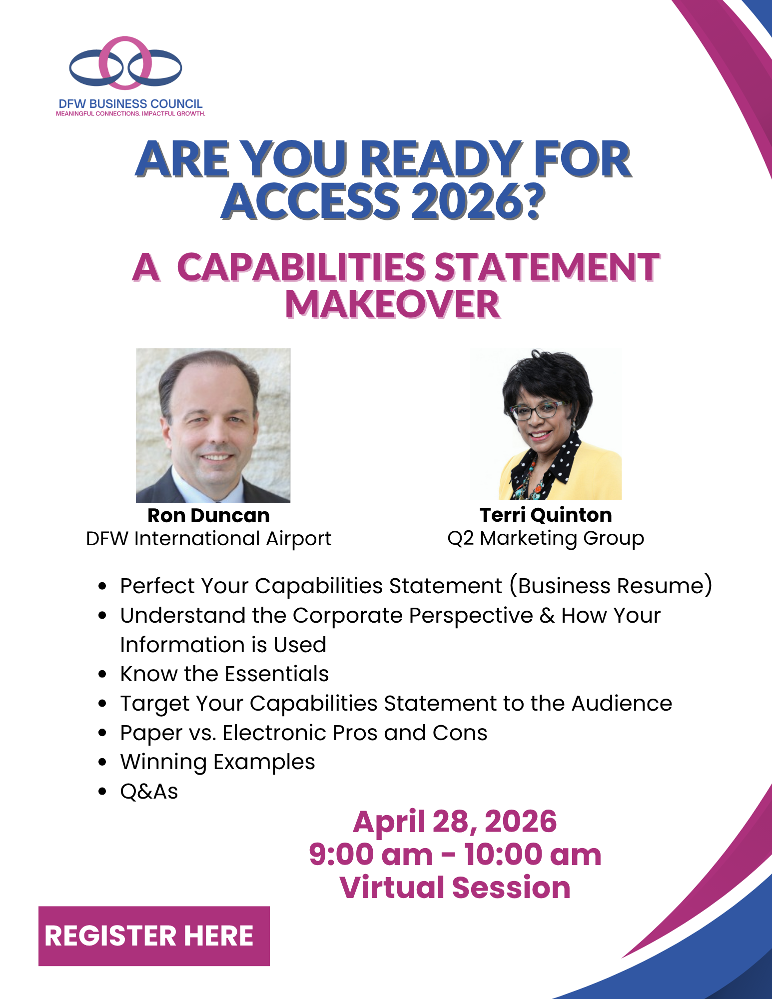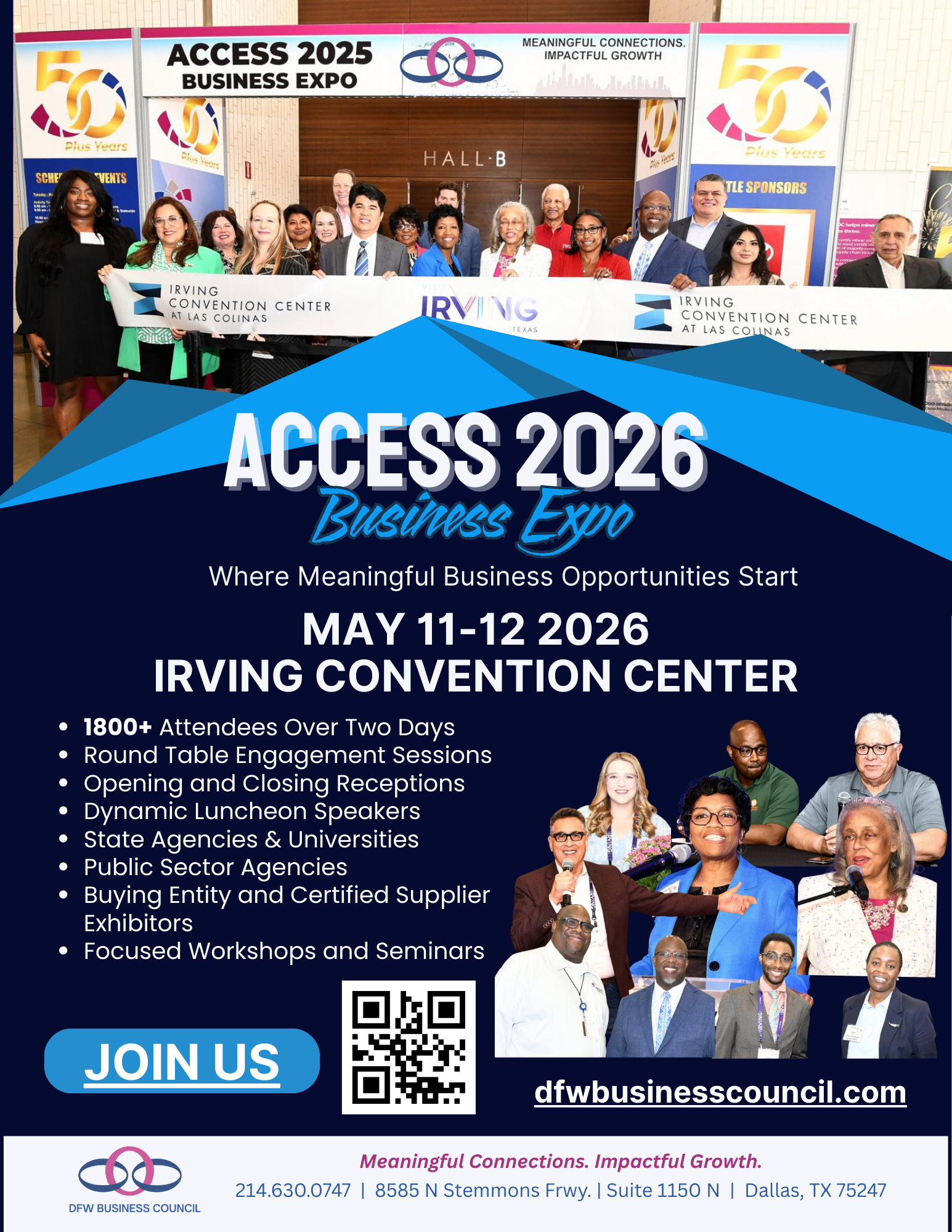 As a community of entrepreneurs, corporate executives, and economic development thought leaders, DFW Business Council is committed to the elimination of discrimination in all areas of business and the provision of equal opportunity when accessing capital, contracts, and contacts.