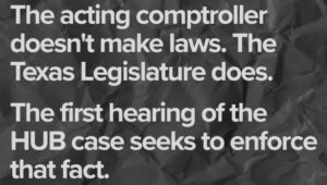 This Public Court Hearing is the first step and first hearing of the HUB case which seeks to enforce the fact that the acting comptroller does not make law. The Texas Legislature does. Your Business. Your Voice.